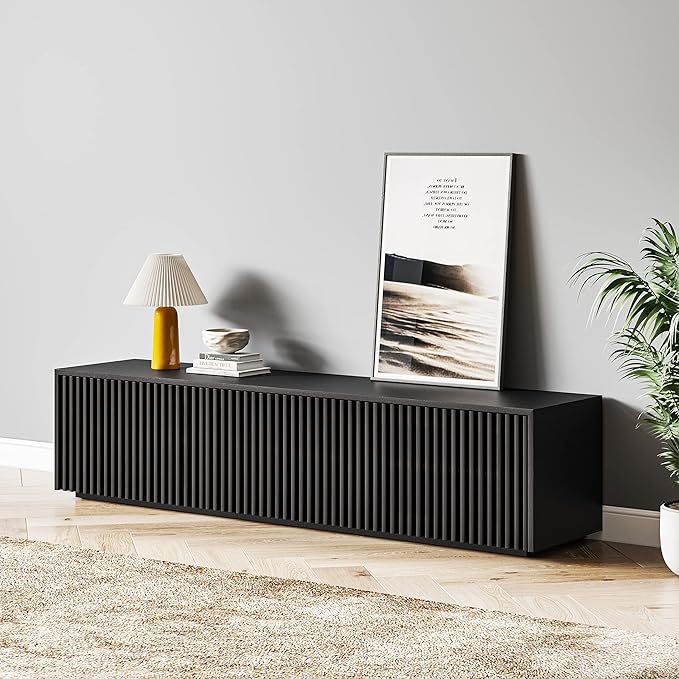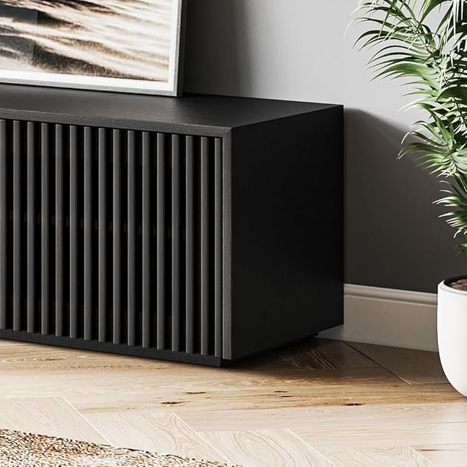 POVISON Modern Solid Wood TV Stand, Black Entertainment Center for 65 inch TV, Full Assembled Media Console with Storage, Farmhouse Low TV Cabinets for Living Room Bedroom, Oak Veneer