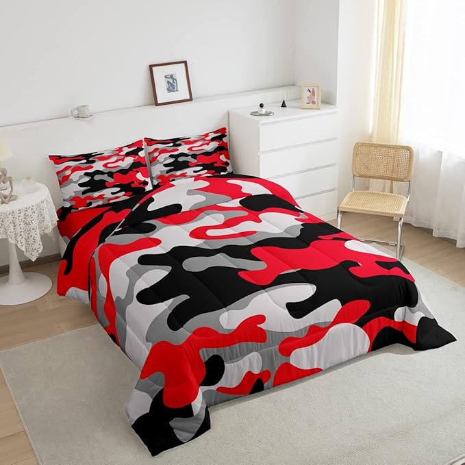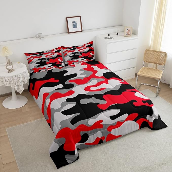 Queen Size Camouflage Comforter Set 3Pcs Kids Bedding Set for Boys Girls Teens 1 Comforter & 2 Pillowcases(Queen,Red Black) Boys