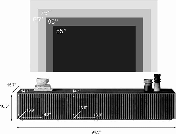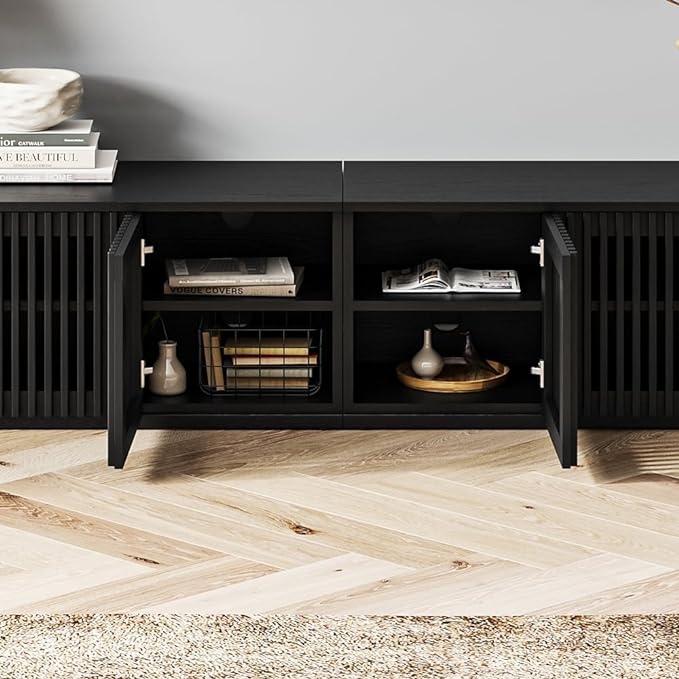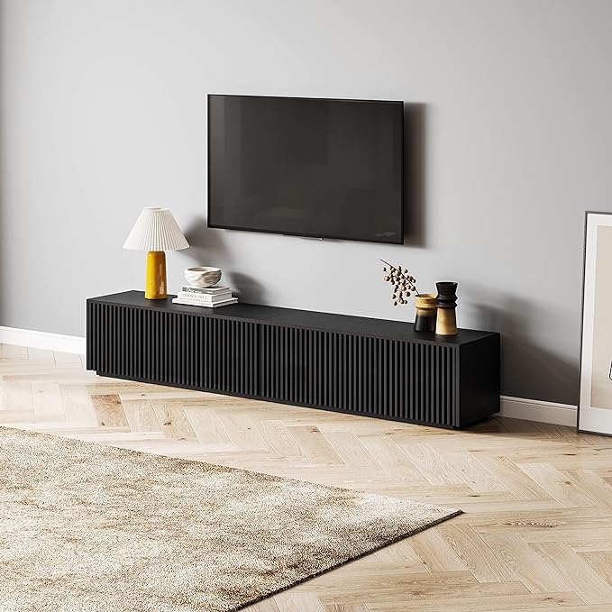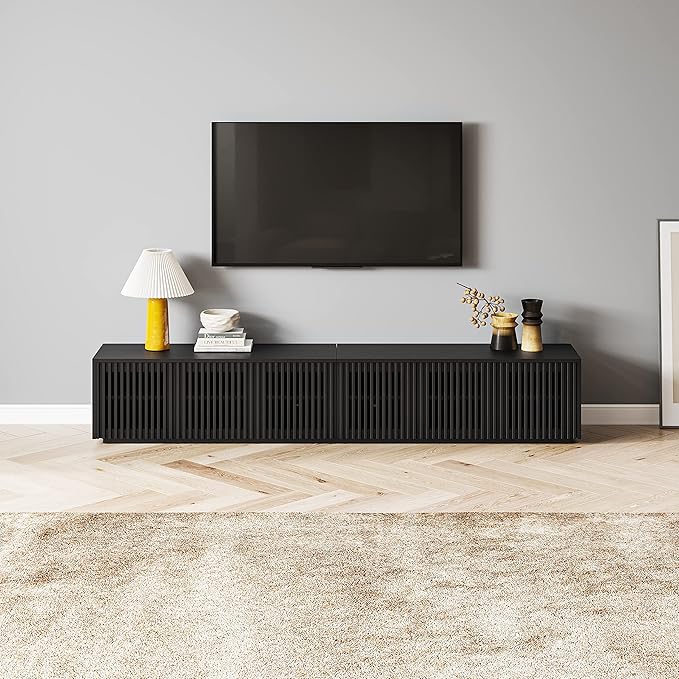 POVISON Modern Solid Wood TV Stand, Black Entertainment Center for 75+ inch TV, 95'' Media Console with Storage for Living Room Bedroom, Farmhouse Low TV Cabinet, Partial Assembly Required