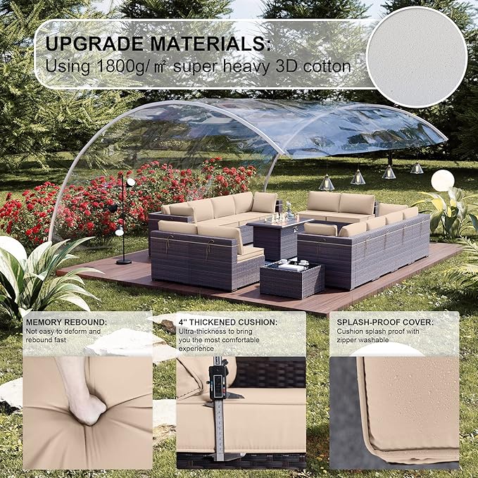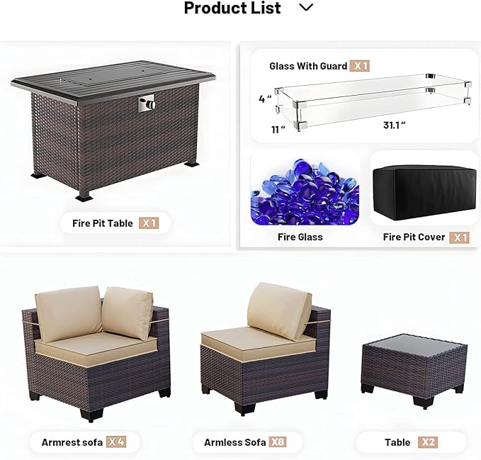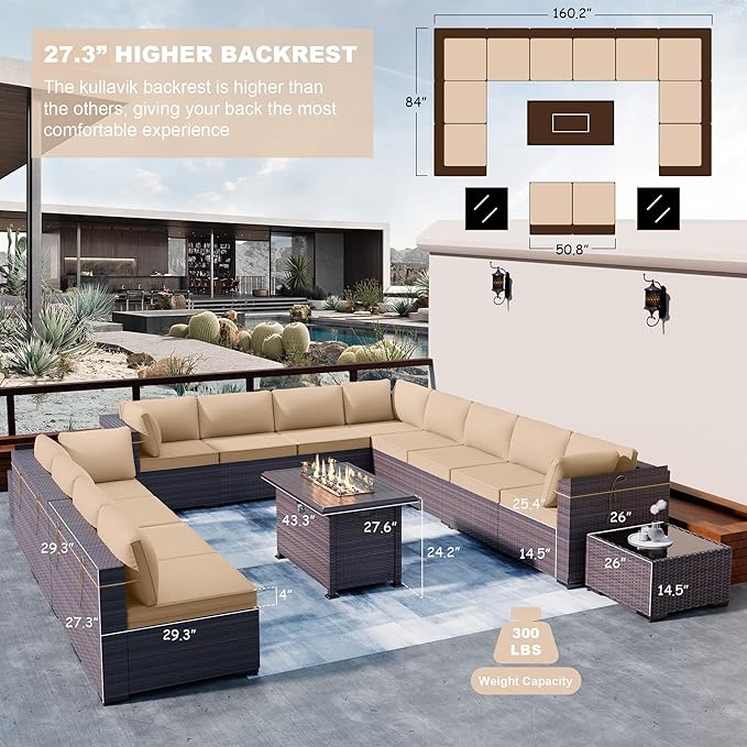 Kullavik 15 Pieces Outdoor Patio Furniture Set with 43" 55000BTU Gas Propane Fire Pit Table PE Wicker Rattan Sectional Sofa Patio Conversation Sets,Khaki