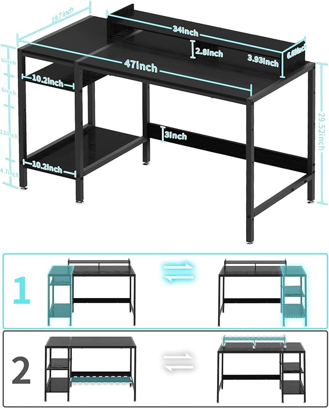 Computer Desk - 47” Gaming Desk, Home Office Desk with Storage, Small Desk with Monitor Stand, Storage Space-Savor, Modern Table, Black.