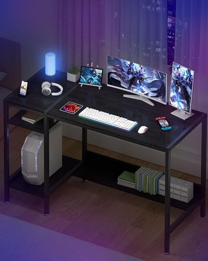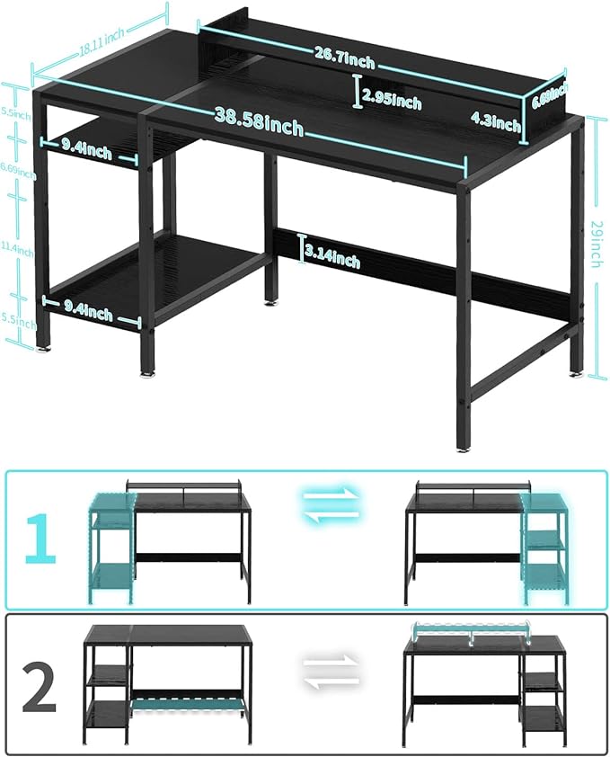 Computer Desk - 38” Gaming Desk, Home Office Desk with Storage, Small Desk with Monitor Stand, Writing Desk for 2 Monitors, Adjustable Storage Space, Modern Design Corner Table, Black.