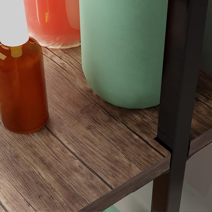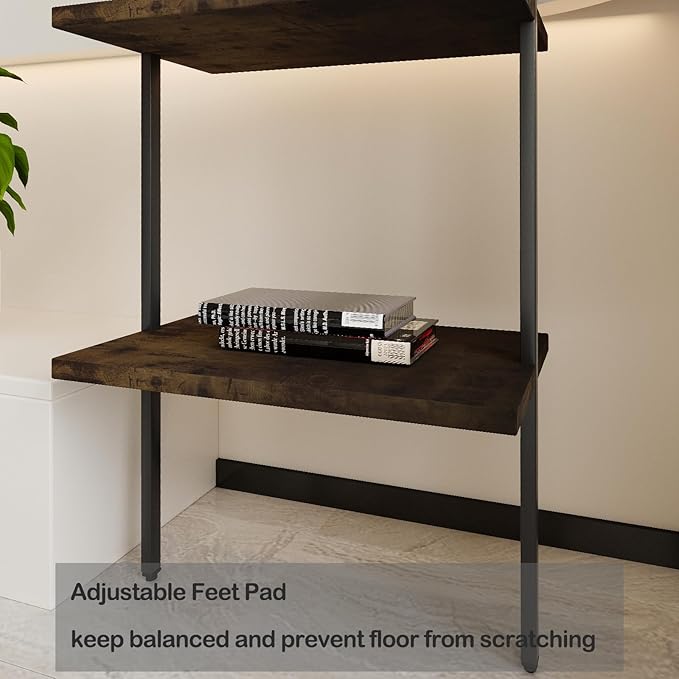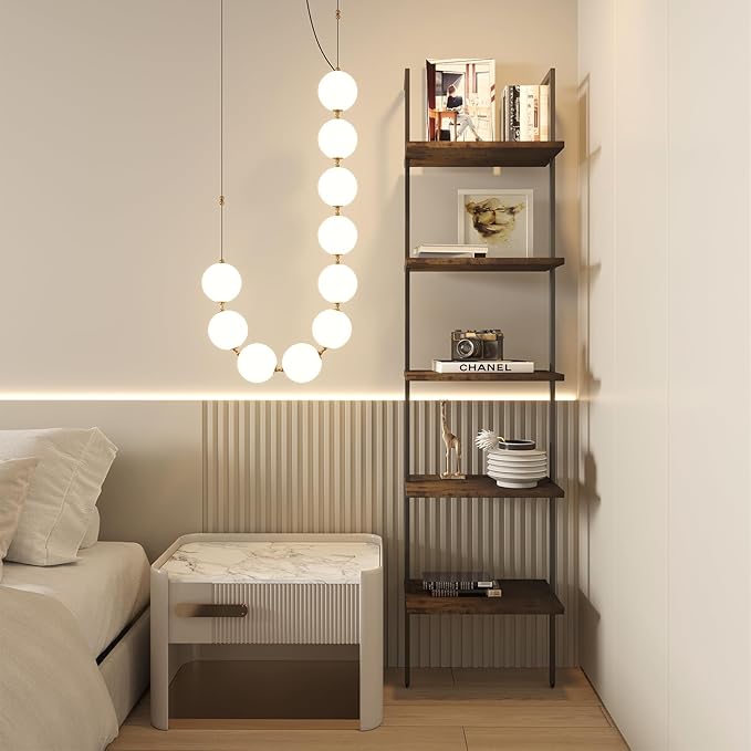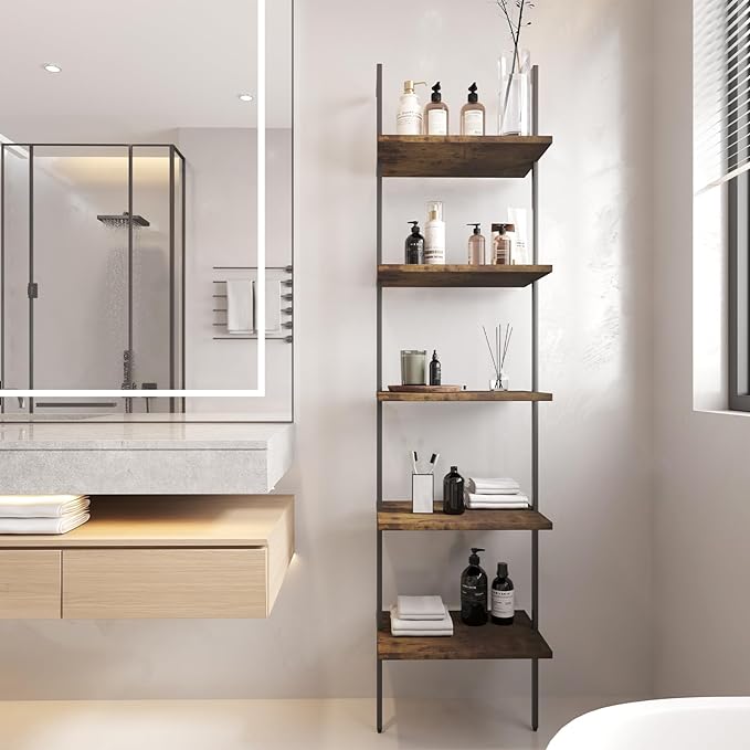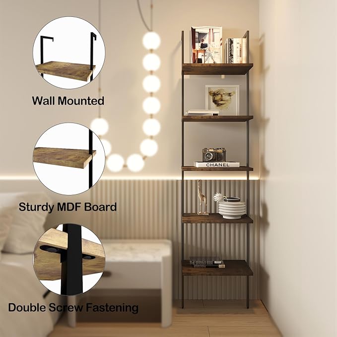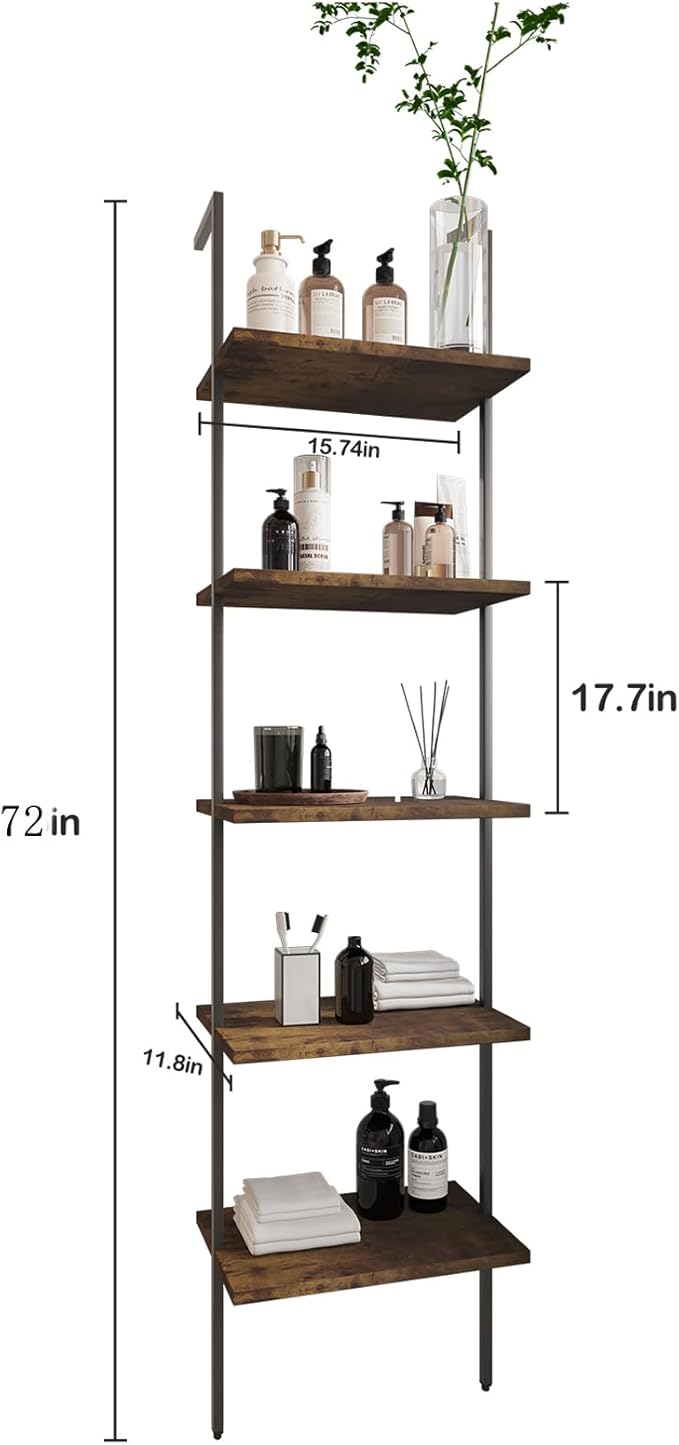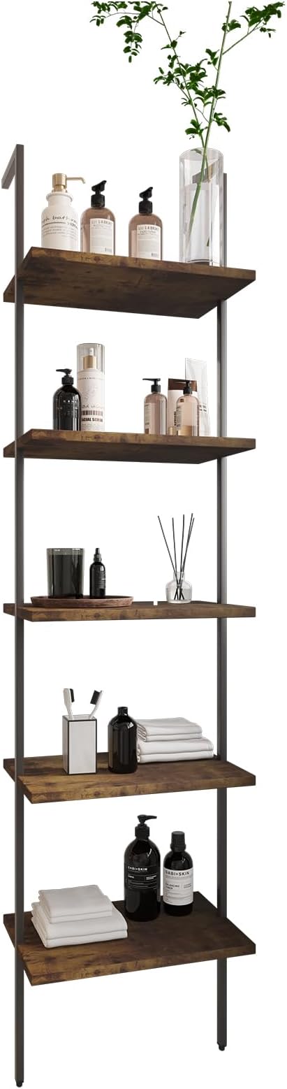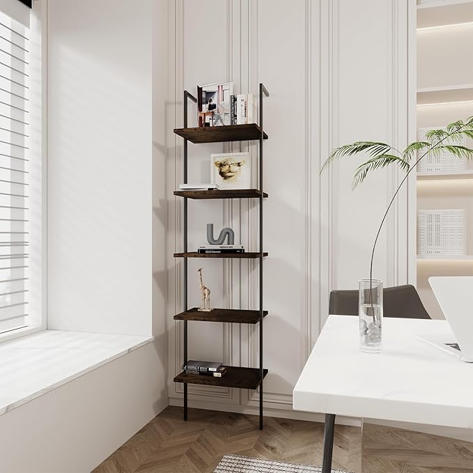 Ladder Shelf 5 Tiers Metal Industrial Bookshelf,Rustic Brown Wood Tall Open Storage Rack and Display Shelves,Wall Mount Wide Book Case for Home Office Bedroom,Small