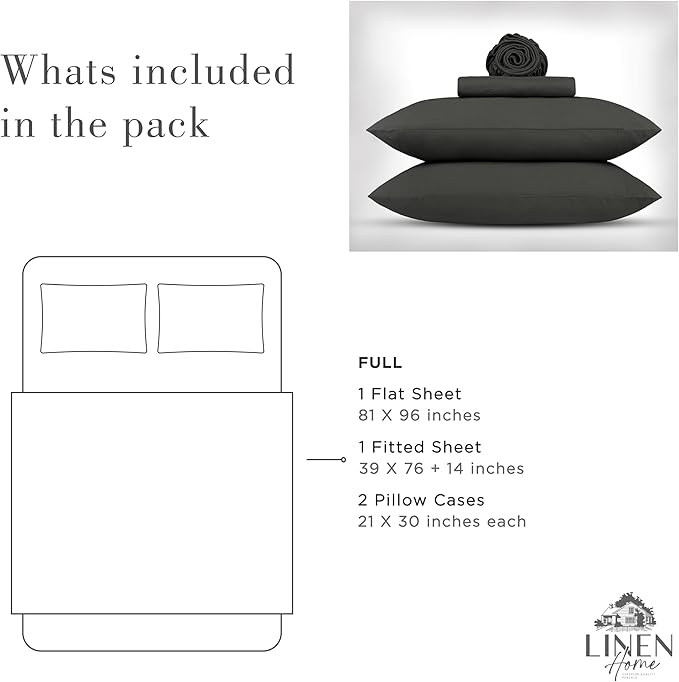 Linen Home Washed Cotton Percale Full Sheet Set, Charcoal, Deep Pocket, 4 Pieces Bed Sheets - 1 Flat Sheet, 1 Fitted Sheet & 2 Envelope Closure Pillowcases, Cool and Comfortable Bed Linen