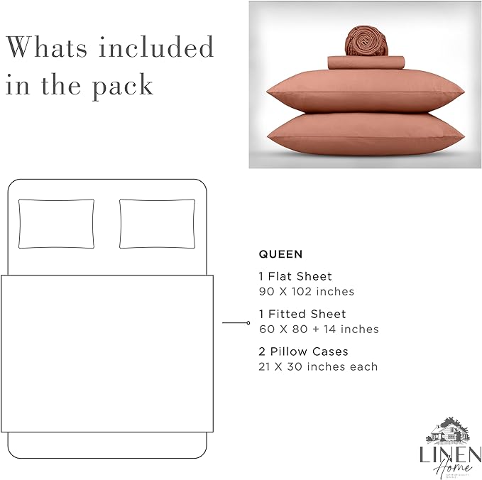 Linen Home Washed Cotton Percale Queen Sheet Set, Tera Clay, Deep Pocket, 4 Pieces Bed Sheets - 1 Flat Sheet, 1 Fitted Sheet & 2 Envelope Closure Pillowcases, Cool and Comfortable Bed Linen