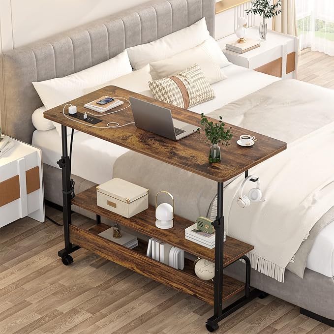 Height Adjustable Standing Desk with Power Outlets, 39" Manual Stand Up Desk with Storage Shelves Small Mobile Rolling Computer Desk Portable Laptop Table with Wheels for Home Office, Rustic