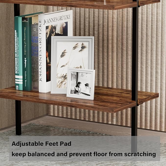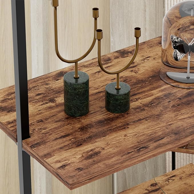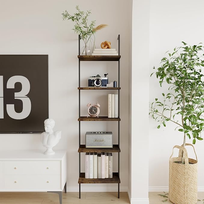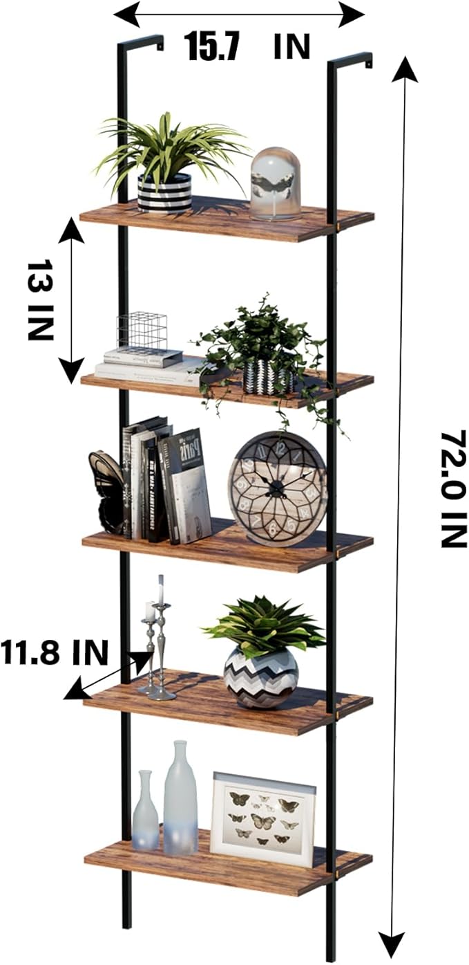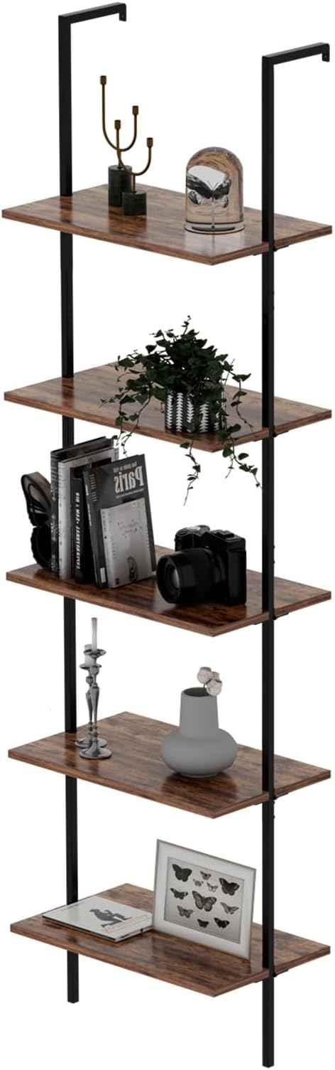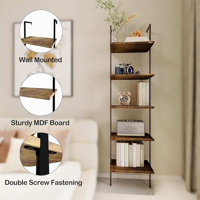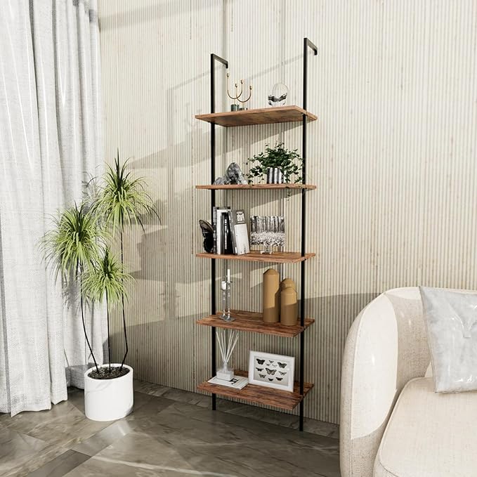 aboxoo Ladder Shelf 5 Tiers Metal Industrial Bookshelf, Rustic Brown Wood Tall Open Storage Rack and Display Shelves Plant Stand,Wall Mount Wide Book Case for Home Office Bedroom,Small