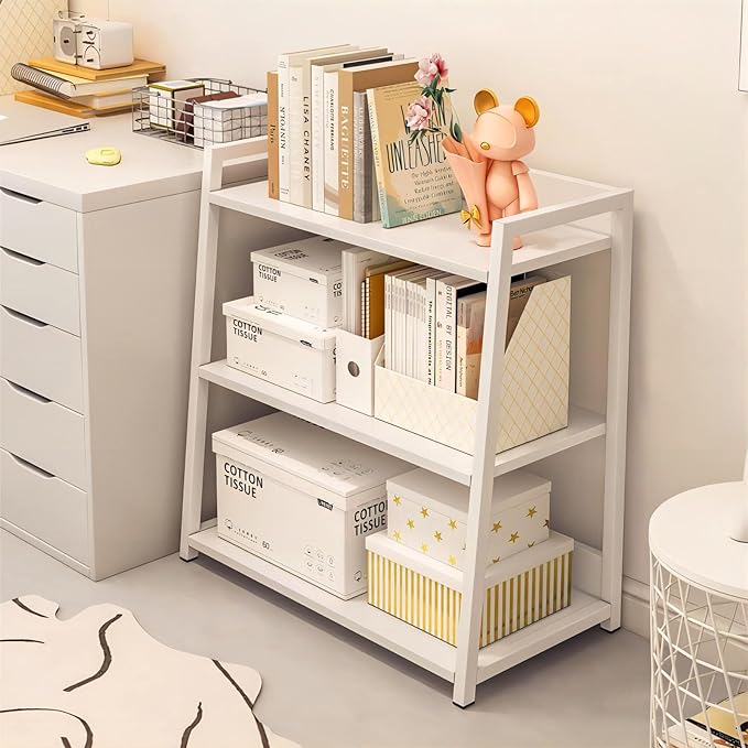 IOTXY 3-Tier Ladder Shelf Bookcase - Wooden Open Bookshelf with Metal Frame, Display Rack for Living Room, Bedroom, Kitchen, and Home Office, White