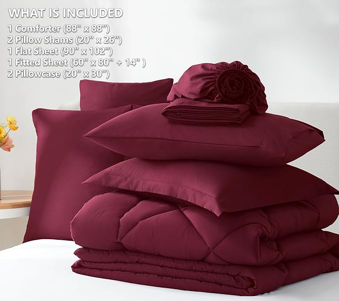 CozyLux Queen Comforter Set with Sheets 7 Pieces Bed in a Bag Burgundy All Season Bedding Sets with Comforter, Pillow Shams, Flat Sheet, Fitted Sheet and Pillowcases, Red, Queen