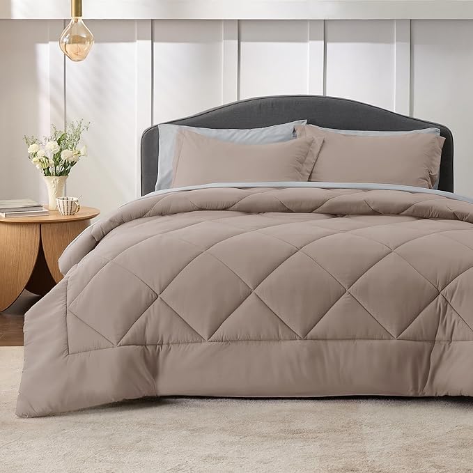 Bedsure Taupe Full Size Comforter Set - 7 Pieces Reversible Full Bed in a Bag Full Bed Set with Comforters, Sheets, Pillowcases & Shams, Full Bedding Sets