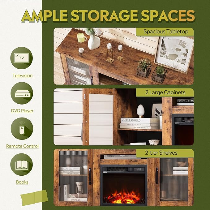 WLIVE Fireplace TV Stand for 65" TV, Entertainment Center with 18 Inch Electric Fireplace, TV Console with Open Shelves for Living Room and Bedroom, Rustic Brown