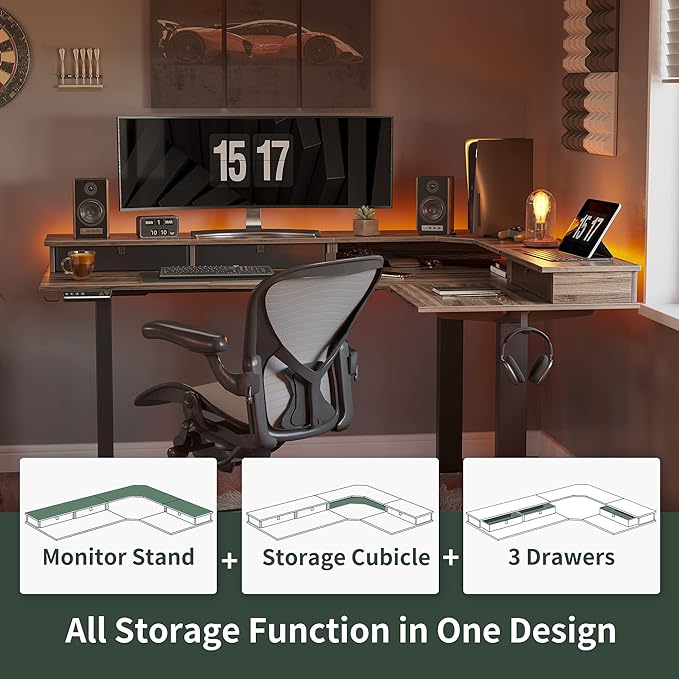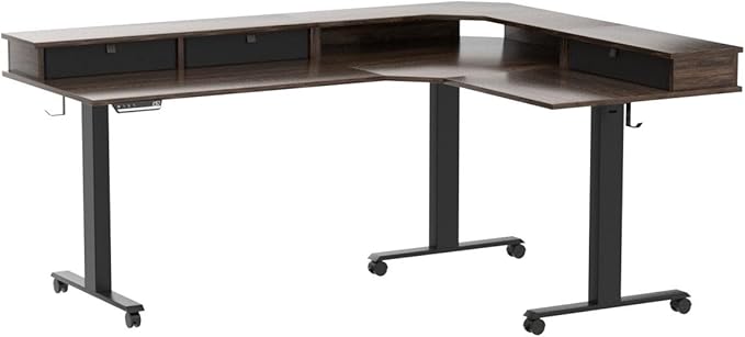 FEZIBO Triple Motor 63" L Shaped Standing Desk with 3 Drawers, Electric Gaming Desk Adjustable Height, Corner Stand up Desk with Splice Board, Black Frame/Black Walnut Top