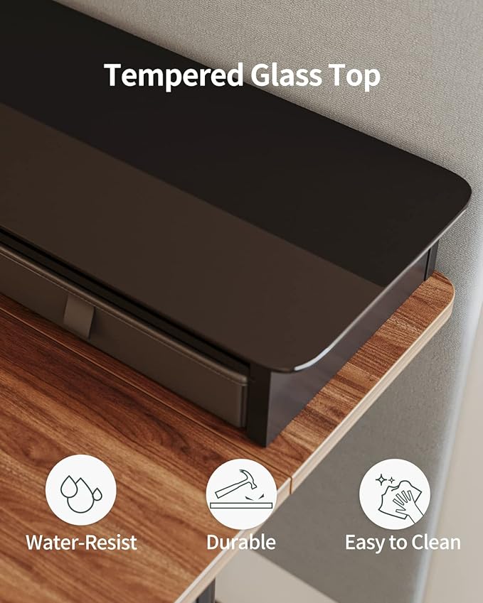 BANTI 48"x 26" Electric Standing Desk with Glass Top Monitor Stand, Adjustable Sit Stand Up Table with Double Drawer, Sit Stand Desk with Storage Shelf, Black Walnut Top