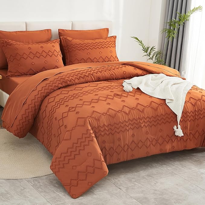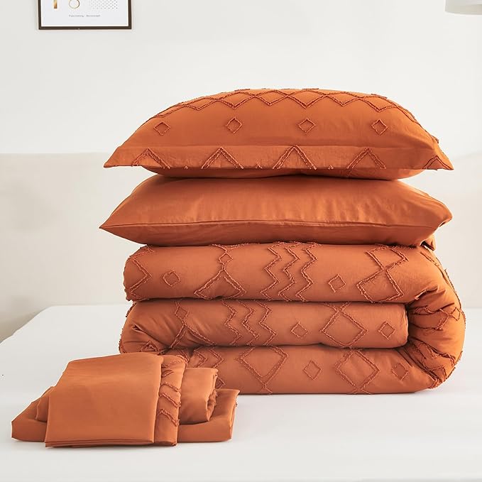 EMME Twin Comforter Set - 5 Pcs Pumpkin Boho Bedding Sets, Tufted Comforter with Sheets, Shabby Chic Embroidery Twin Size Bed Set Fluffy Bed Bag for All Season(68"X90")