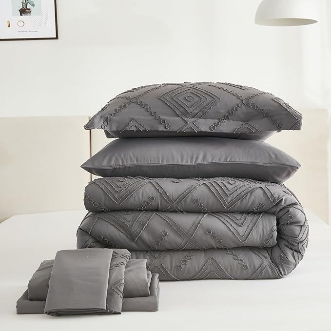 EMME Twin Comforter Set - 5 Pcs Dark Grey Boho Bedding Sets, Twin Size Tufted Comforter with Sheets, Shabby Chic Embroidery Bed Set Fluffy Bed Bag for All Season(68"X90")