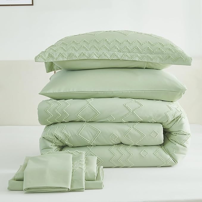 EMME Queen Comforter Set - 7 Pcs Sage Green Boho Bedding Sets, Full Size Tufted Comforter with Sheets, Shabby Chic Embroidery Queen Bed Set Fluffy Bed Bag for All Season(90"X90")