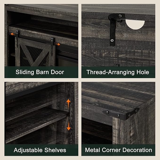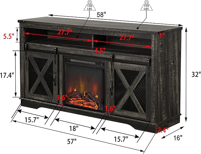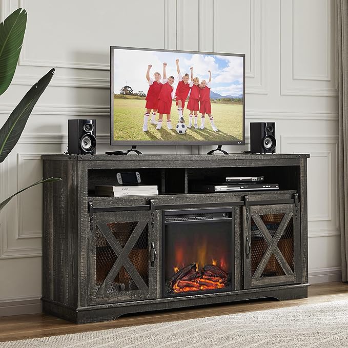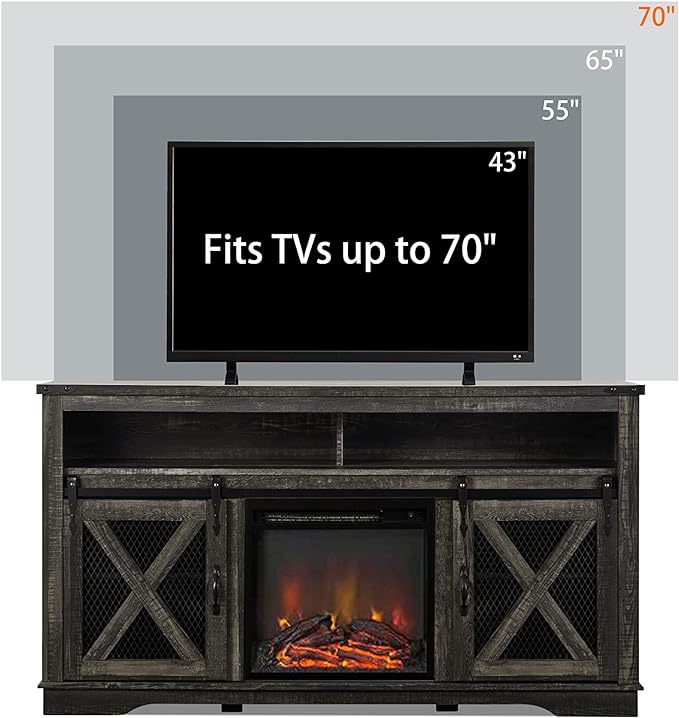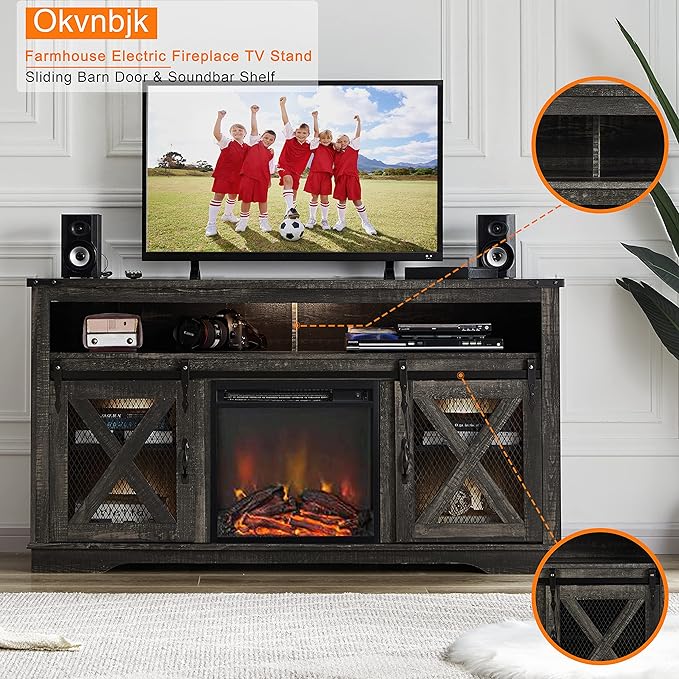 Okvnbjk Fireplace TV Stand for TVs up to 70", Entertainment Center with 18" Electric Fireplace, Farmhouse TV Stand Industrial Media Console with Sliding Barn Door for Living Room, 58 Inch, Dark Oak