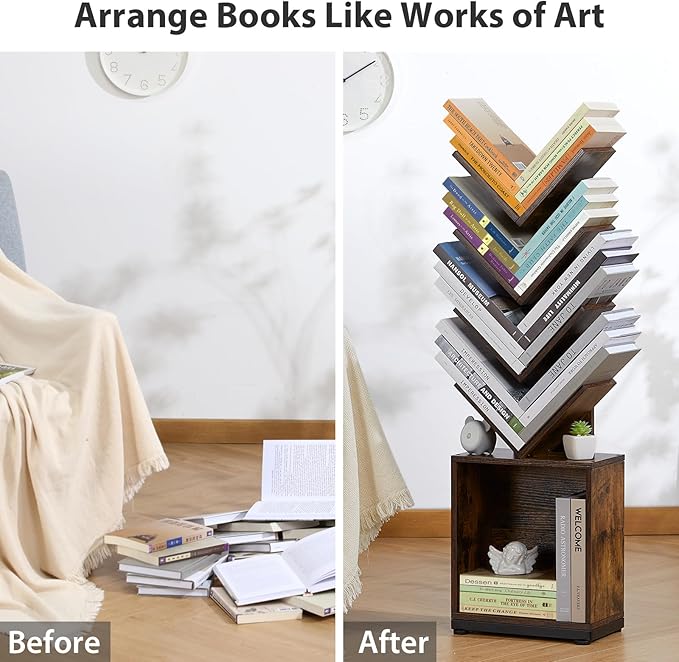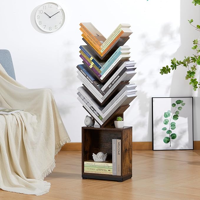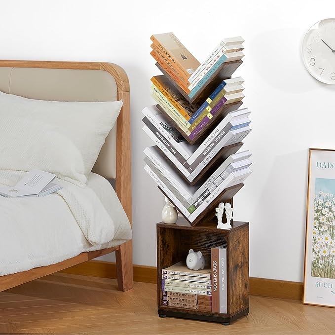ruboka 5-Shelf Tree Bookshelf with Storage, 37.9-Inch Retro Floor Standing Bookcase Display for CDs/Magazine/Books, Small Bookshelf for Bedroom, Living Room, Office, Brown Storage Shelves