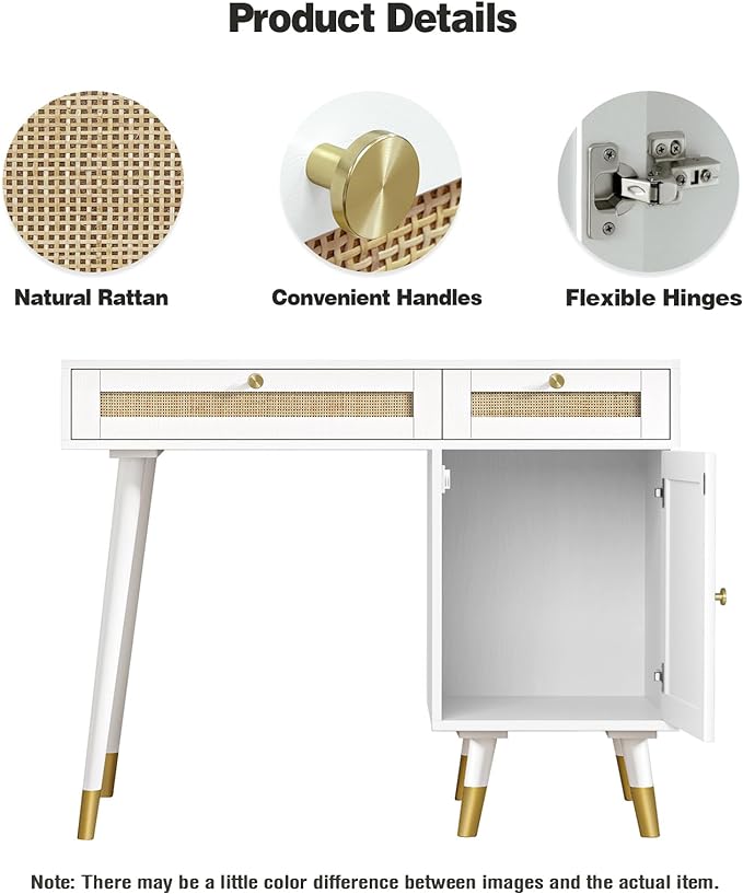 Anmytek Rattan Vanity Desk with Drawers and Storage, White Makeup Vanity Table Modern Home Office Desk Computer Desk for Study D0006