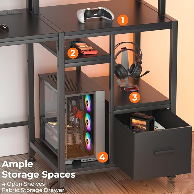 GreenForest 55 inch Computer Desk with Drawers and Outlets, Home Office Desk with Storage and Printer Shelf, Work Desk with Fabric File Drawer, Study Desk with Monitor Stand, Computer Table, Black