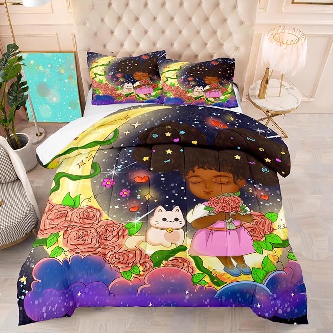3Pcs Black Girl Bedding Set - Black Girl Twin Bedding Set for Girls, Ultra Soft Microfiber African Black Girls Room Set, Black Girls Twin Comforter Set for Girls, Full (1 Comforter 1 Pillowcases)