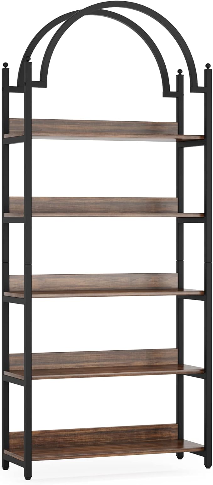 Tribesigns 5-shelf Arched Bookcase Set of 2, Rustic Wood Shelf with Black Metal Frame, Industrial Metal Etagere Open Bookshelf (2, Brown+Black)