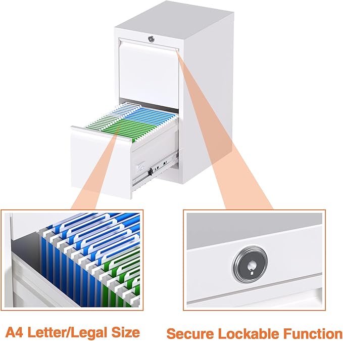 2 Drawers Vertical File Cabinet, Metal Lockable Filing Cabinet, Office File Storage Cabinet for A4 Letter/Legal Size, Assembly Required (White)