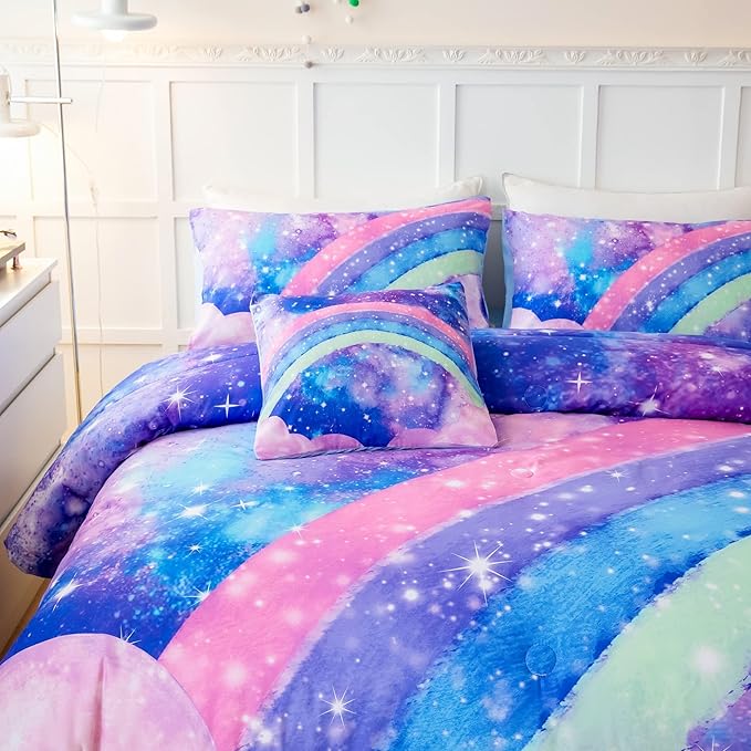 Rainbow Nebula Teen Bedding Comforter Set for Girls, Gradient Glitter Bedding Set Full Size, 3D Tie Dye Blue Comforter Bedding Sets, 6Pcs Bed in A Bag for All Season