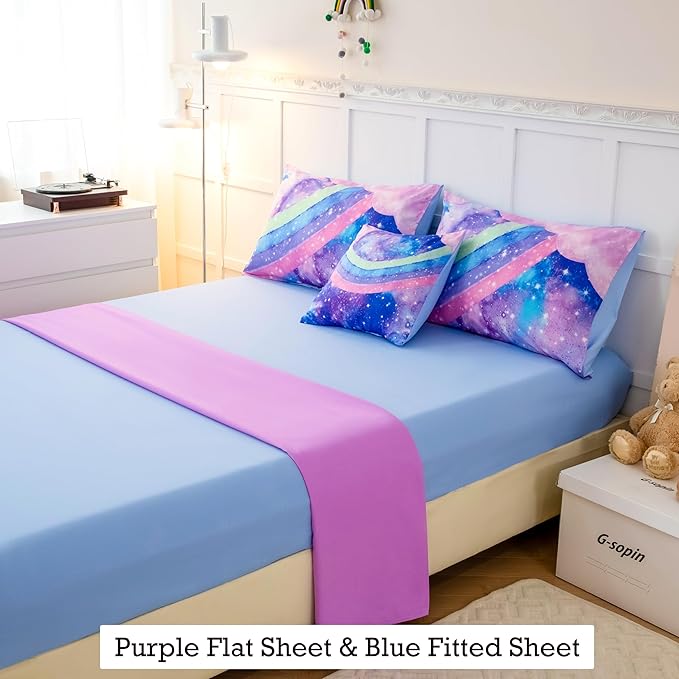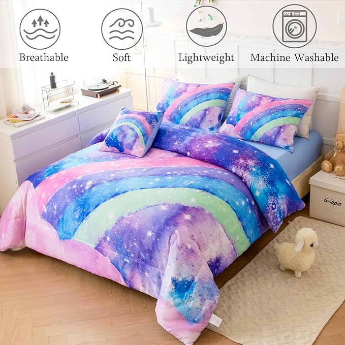 Tie Dye Blue Teens Comforter Set Queen for Girls, 3D Rainbow Gradient Glitter Bed in A Bag, 6 Pieces Twinkle Nebula Comforter Kids Bedding Set for All Season