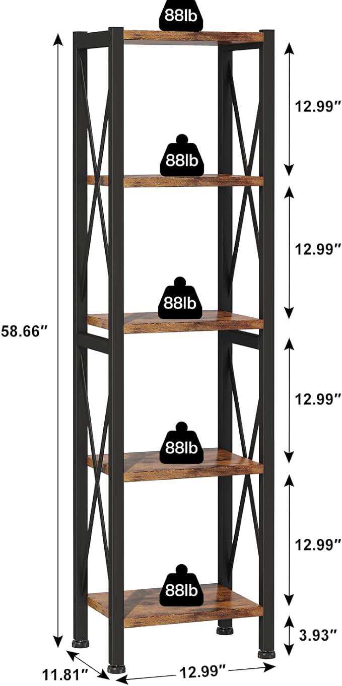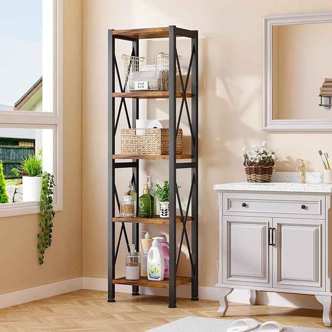 5-Tier Narrow Bookshelf, Ladder Bookshelf, Tall Bookshelf for Bedroom with Open Shelves, Office Bookshelf, Industrial Standing Bookshelf for Bedroom, Living Room and Home Office