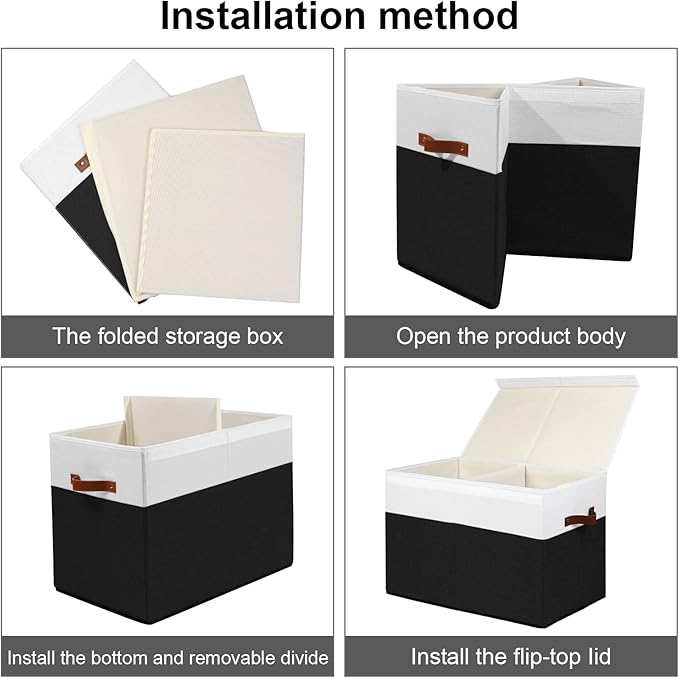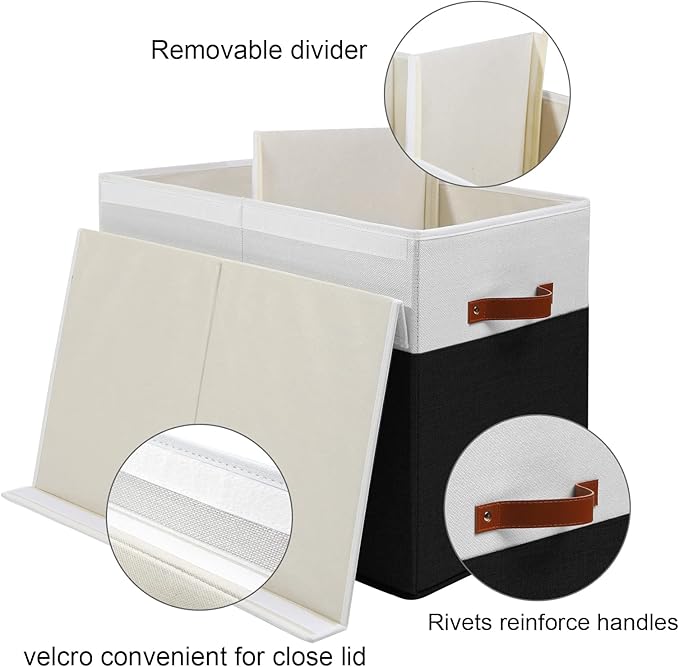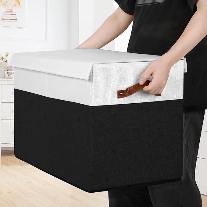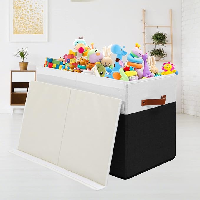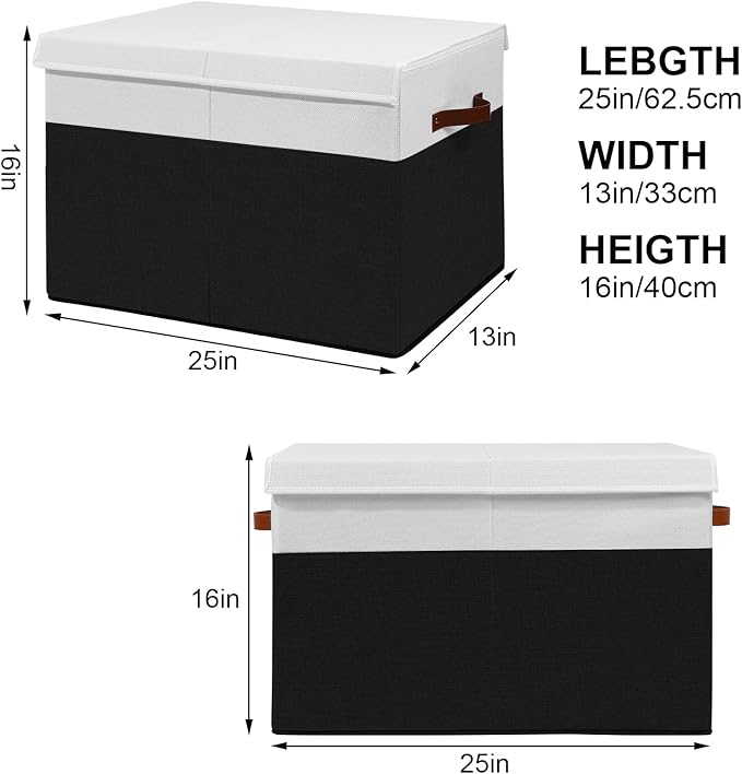 Large Toy Storage Box with Lid, Sturdy Toys Storage Chest Bin Organizer Basket with Dividers for Kids, Boys, Girls, Nursery, Closet, Bedroom, Playroom 25"x13" x16" (Black and White)