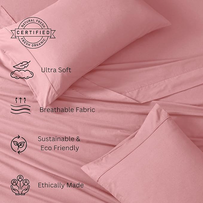 LANE LINEN 100% Organic Cotton Queen Sheets Set, 4-Piece Pure Organic Cotton Percale Sheets Queen, Cotton Bedsheets, Ultra Soft Bedding Sheets, Breathable, Fits Mattress Upto 15" Deep - Rose Dawn