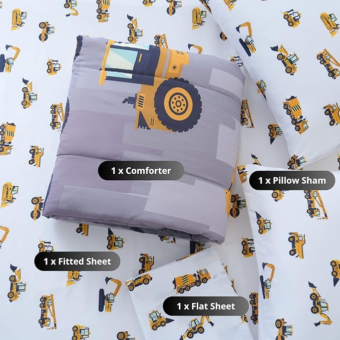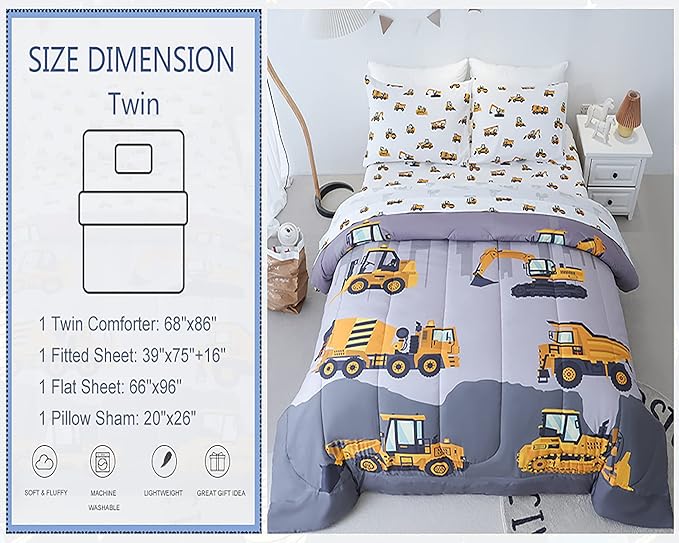 Twin Size Comforter Set for Boys, 4-Piece Bed in a Bag, 3D Construction Bedding Comforter Sheet Set, Ultra Soft and Fluffy, Cartoon Truck Cars