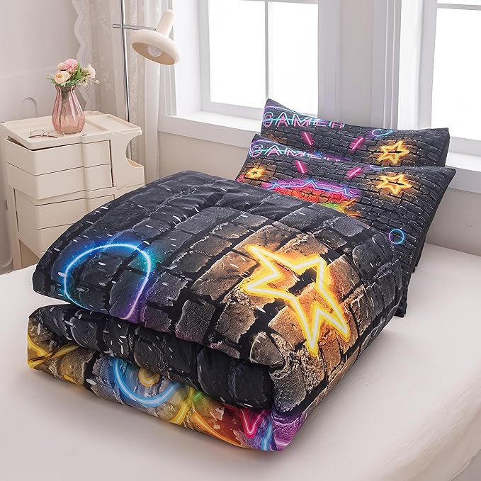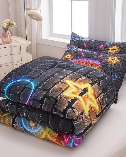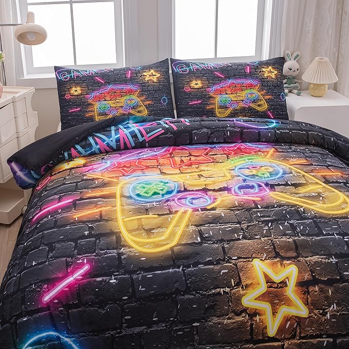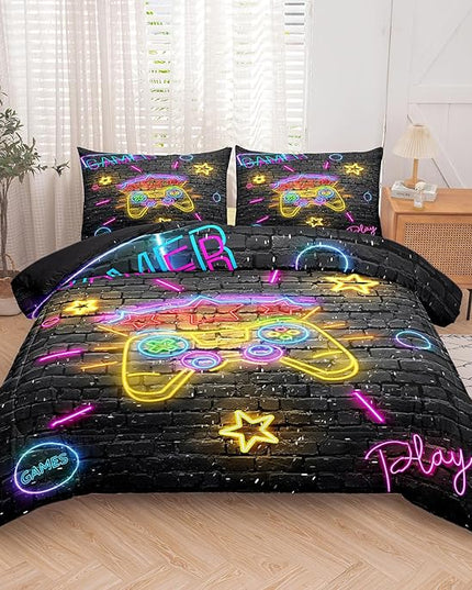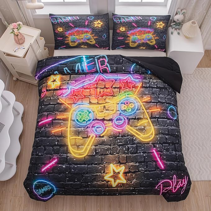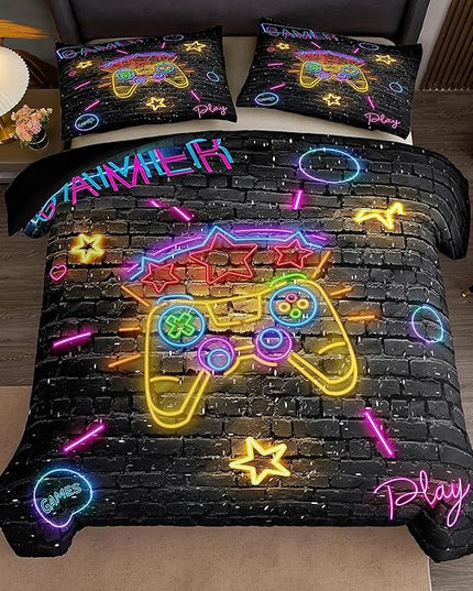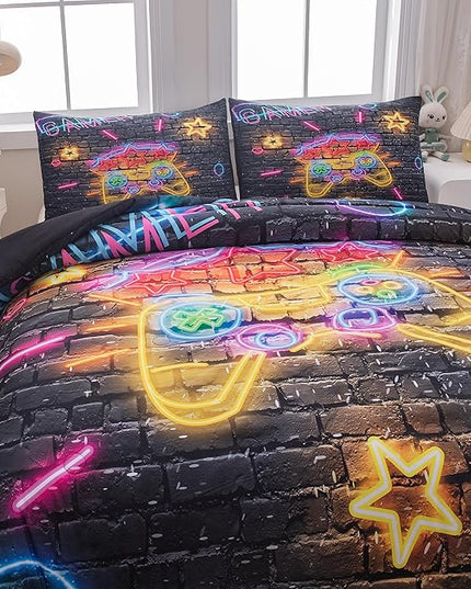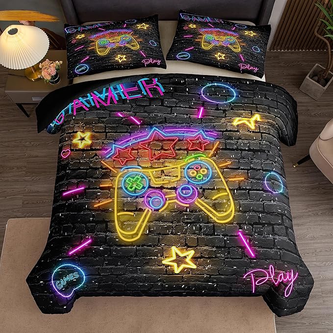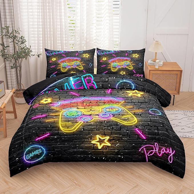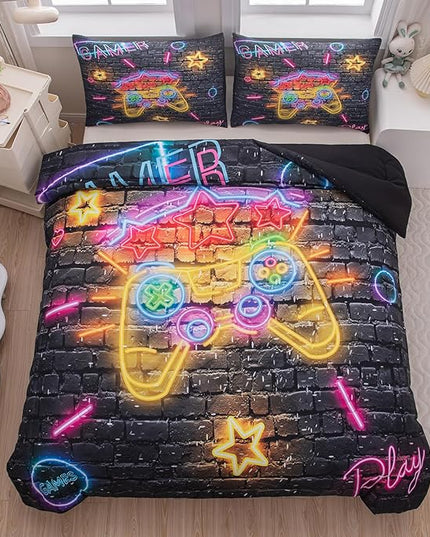 Boys Full Size Bedding Set, Gaming Comforter Sets for Boys, Gamer Bedding Sets for Boys Teens, Neon Kids Bedding Set, Gaming Room Decor for Boys Bedroom(1 Comforter +2 Pillowcases)