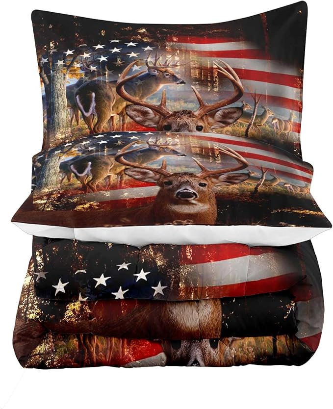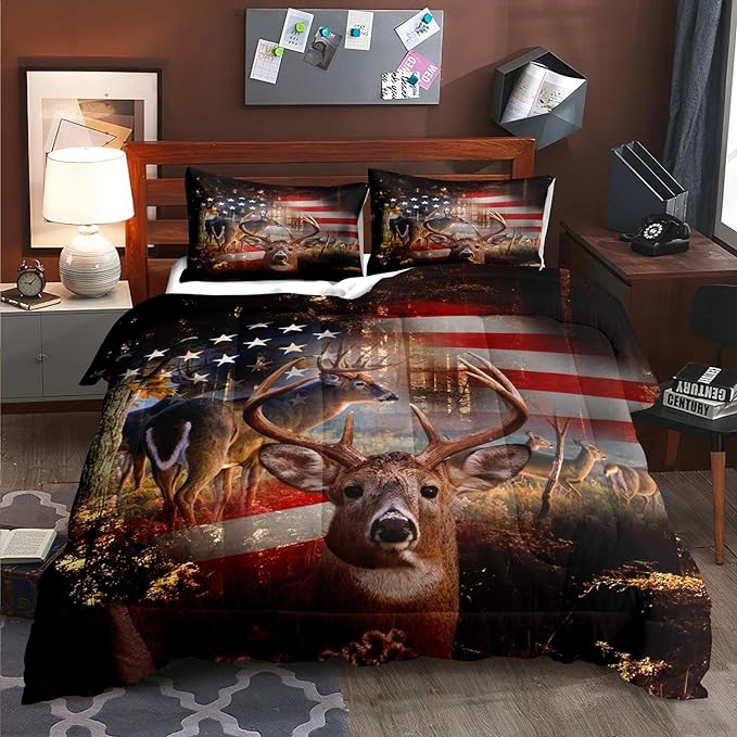LUVIVIHOME 3PCS Camo Hunting Comforter Set, Deer Comforter King Size, Patriotic American Flag Hunter Woodland Forest Animal Elk Moose Wildlife Cabin Lodge Country Rustic Bedding Quilt, 2 Pillow Shams