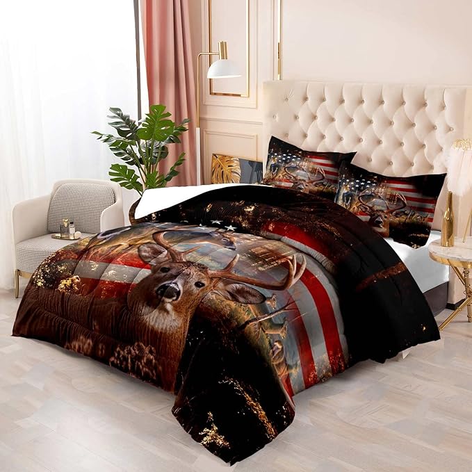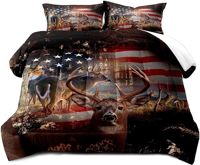LUVIVIHOME 2PCS Hunting Deer Comforter Set, Camo Comforter, Twin Bed Set, Patriotic American Flag Hunter Woodland Forest Animal Elk Moose Wildlife Cabin Country Rustic Bedding Quilt, 1 Pillow Sham