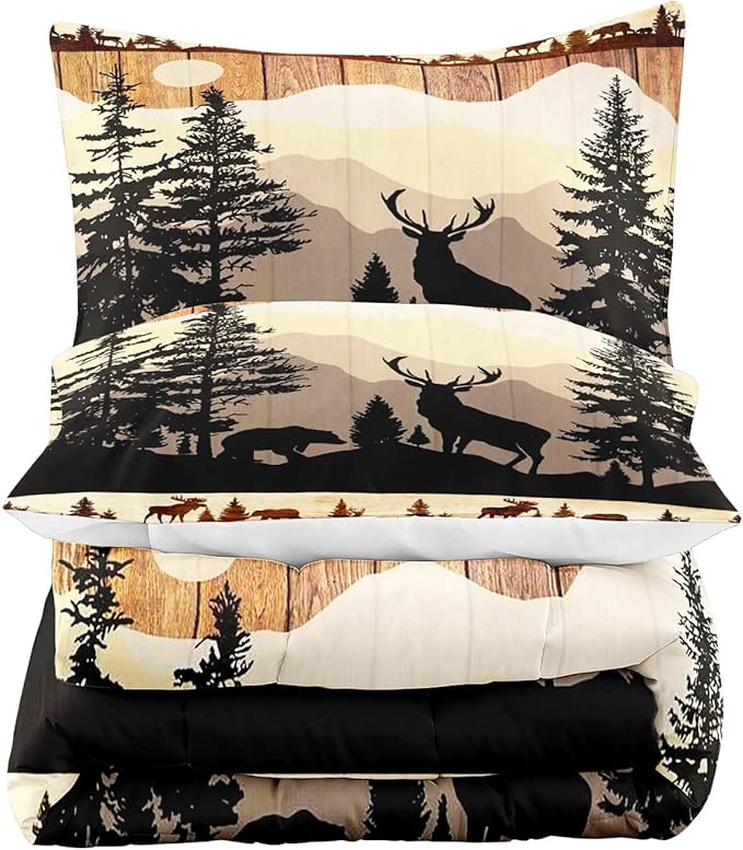 LUVIVIHOME 3PCS Black Bear Deer Comforter Set, Brown Comforter Set Queen, Pine Tree Woodland Forest Animal Elk Moose Wildlife Hunting Cabin Lodge Country Rustic Farmhouse Bedding Quilt, 2 Pillow Shams