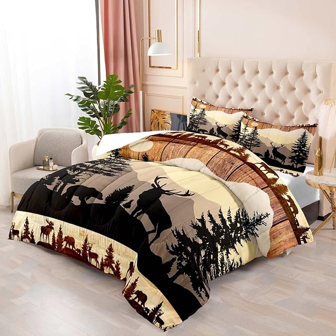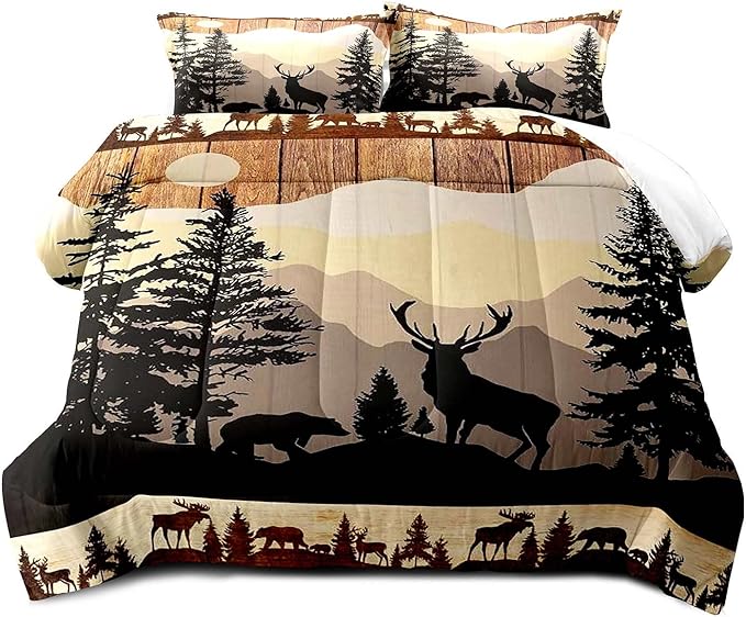 LUVIVIHOME 2PCS Black Bear Deer Comforter Set, Brown Twin Comforter, Pine Tree Mountain Woodland Forest Animal Elk Moose Wildlife Hunting Cabin Lodge Country Rustic Farmhouse Bedding, 1 Pillow Sham