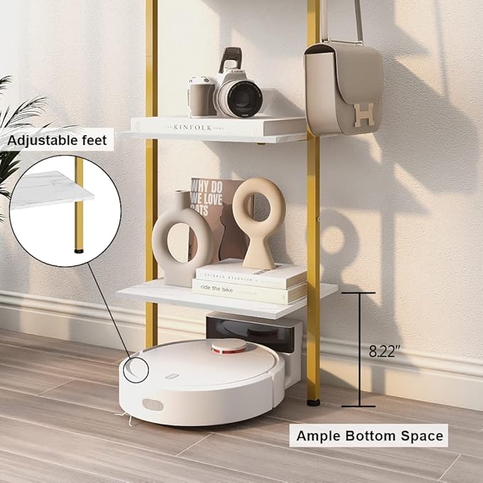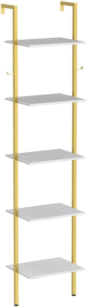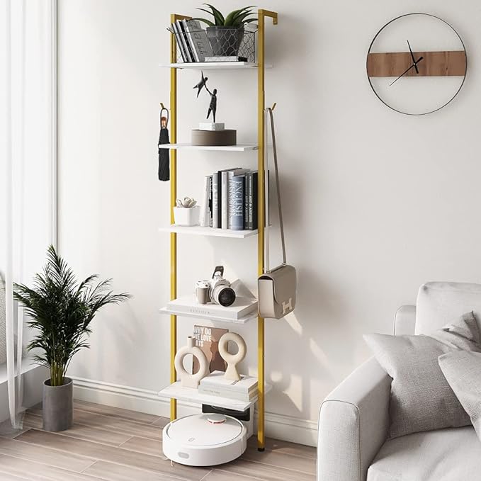 Modern Bookshelf Wall Mounted 5-Tiers Ladder Shelf Gold and White Wooden Bookcase Narrow Thin Bookshelf Open Display Storage Rack for Living Room Bedroom Home Office