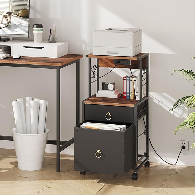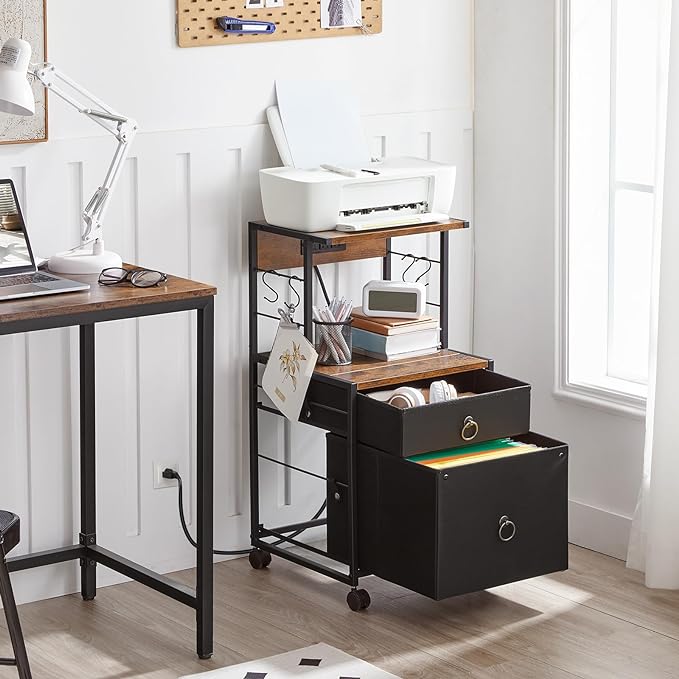 HOOBRO 2-Drawer File Cabinet, Filing Cabinet with Charging Station, Vertical Office Cabinet with Open Storage Shelf, Printer Stand, A4/Letter Size, Nonwovens Drawer, Rustic Brown and Black BFK23UWJ01