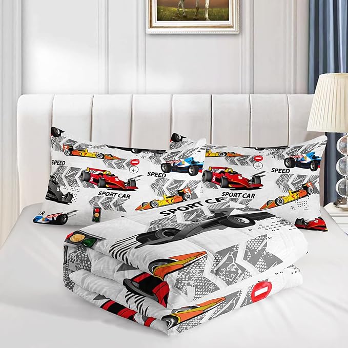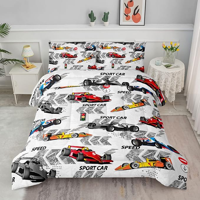 Axolotl Racing Car Comforter Set Queen Size,Extreme Sports Boys Bedding Set for Boys Teens Girls Car Racing Gifts,Race Cars Quilt Bed Set with 1 Comforter 2 Pillowcases,Multi Color