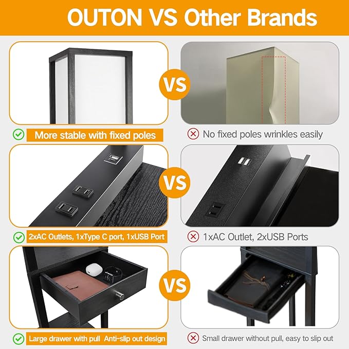 OUTON Floor Lamp with Shelves, 1 Drawer, 2 USB-C Ports, 2 AC Outlets, LED Modern Floor Lamp with 3 Color Temperature, Storage Display Wood Standing Lamp for Living Room, Bedroom, Office (Black)