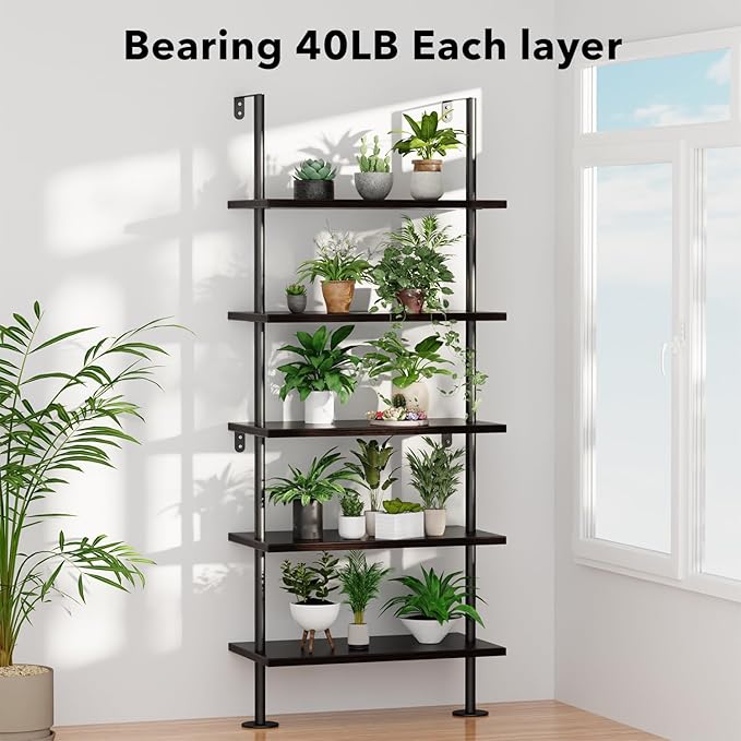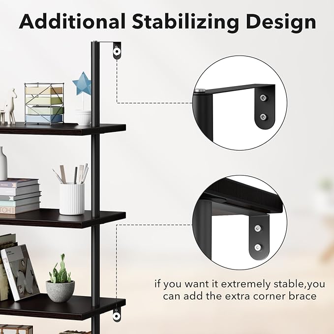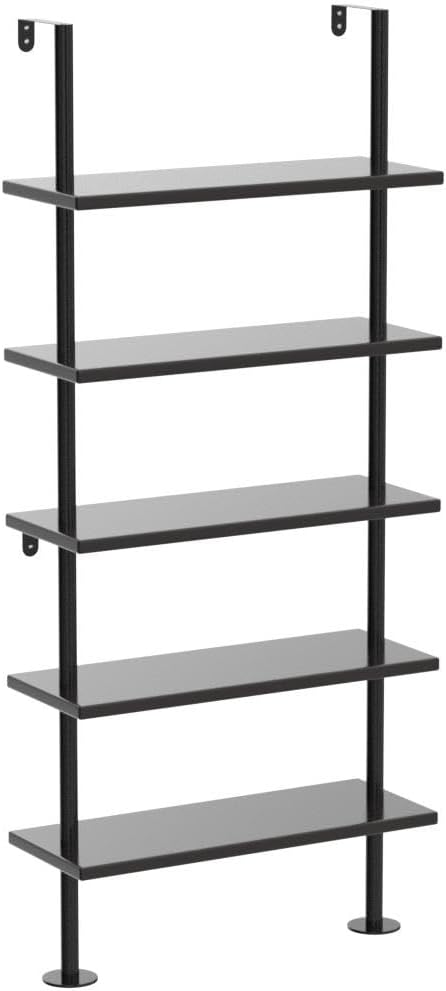 Ladder Shelf Bookcase 5 Tier, Extra Sturdy Modern Bookshelf Wall Mounted, Tall Black Open Book Shelf, Standing Industrial Metal Frame with Wooden Shelves