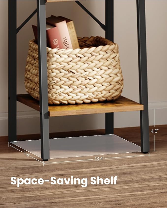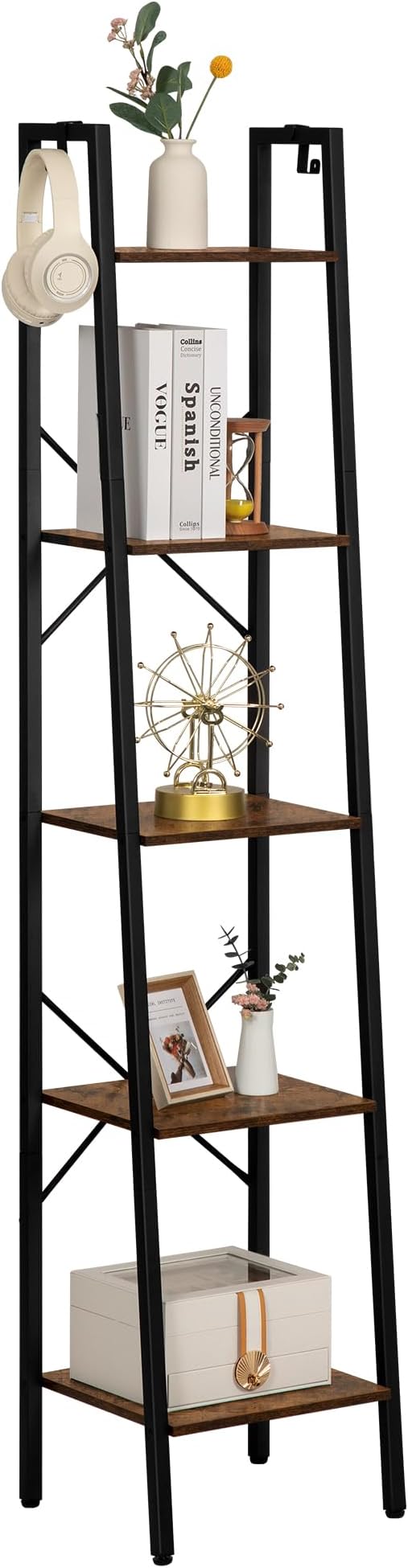 Ladder Shelf, Bookshelf Bookcase, Freestanding Corner Storage Shelve with 2 Hooks for Home Office, Living Room, Kitchen, Bedroom, Industrial, 5-Tier Rustic Brown BC03201B