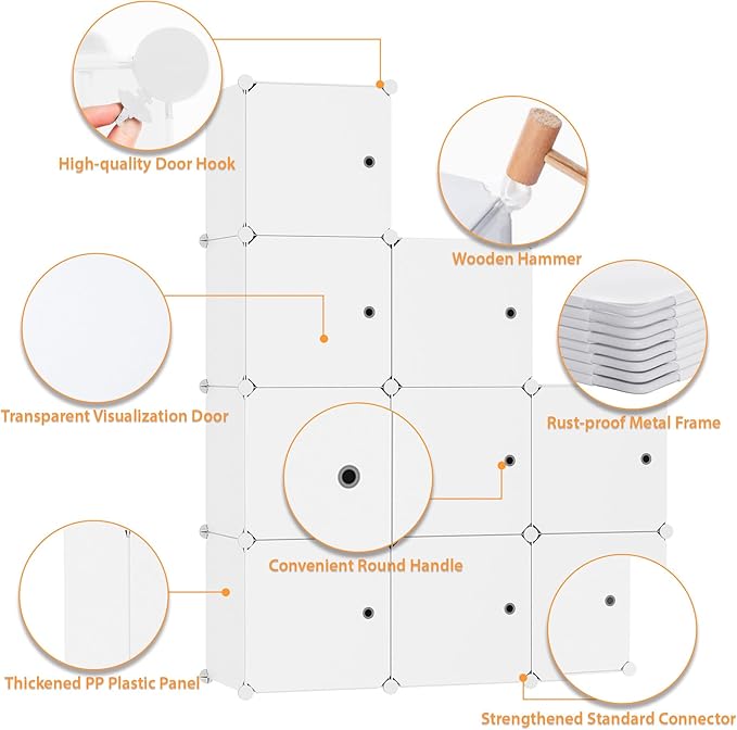 C&AHOME Cube Storage Organizer with Doors, 9-Cube Shelf, Closet Cabinet, DIY Plastic Modular Bookshelf, Storage Shelves Ideal for Bedroom,Living Room,36.6”L x 12.4”W x 36.6”H Milky USHS3009M-DOOR
