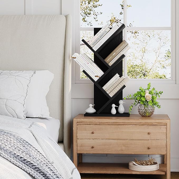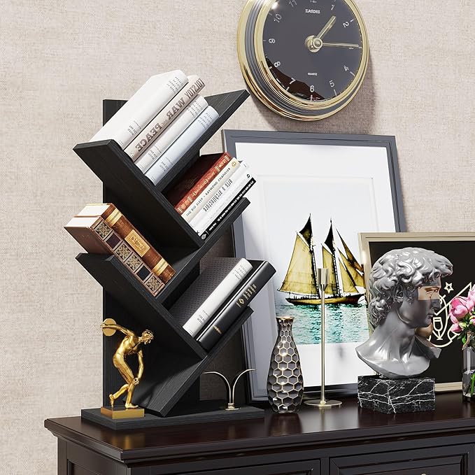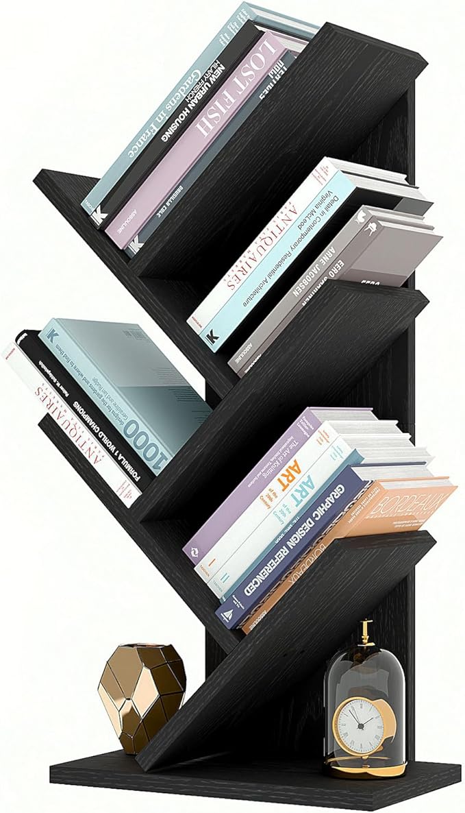 YMYNY 4 Tier Tree Bookshelf, Small Bookcase, Modern Wood Book Storage Rack, Freestanding Book shelf for Books/Movies/CDs, Narrow Display Rack for Living Room, Home Office, Black UHBC014B