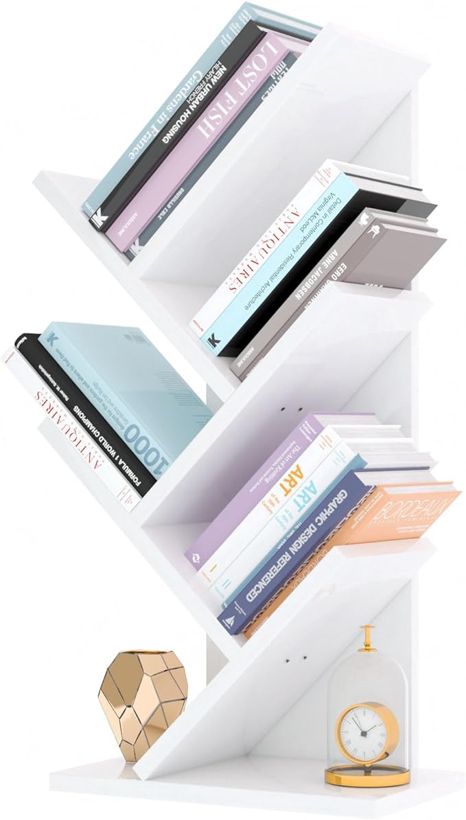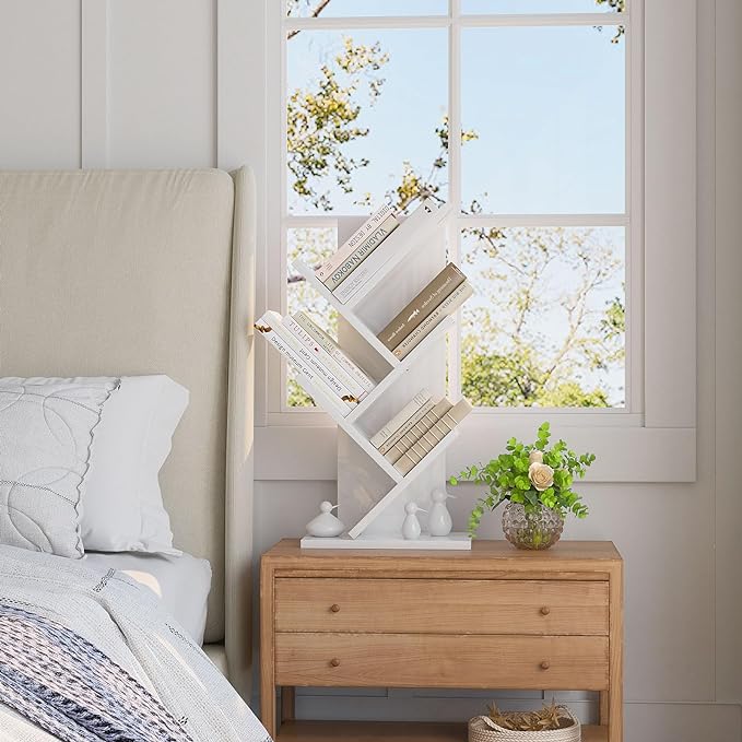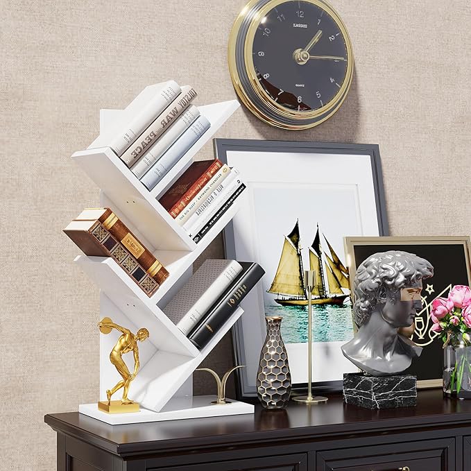 YMYNY 4 Tier Tree Bookshelf, Small Bookcase, Modern Wood Book Storage Rack, Freestanding Book shelf for Books/Movies/CDs, Narrow Display Rack for Living Room, Home Office, White UHBC014W