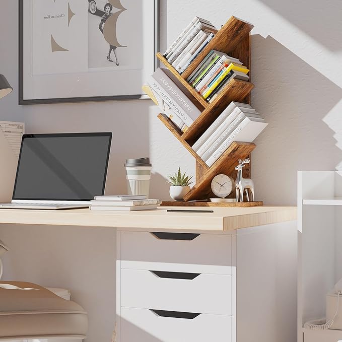 YMYNY 4 Tier Tree Bookshelf, Small Bookcase, Modern Wood Book Storage Rack, Freestanding Book shelf for Books/Movies/CDs, Narrow Display Rack for Living Room, Home Office, Rustic Brown UHBC014H