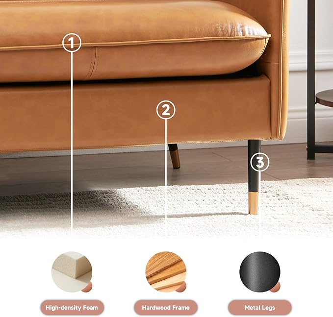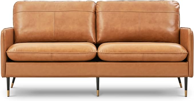 79" Top-Grain Leather Sofa, 3 Seater Leather Couch, Mid-Century Modern Couch for Living Room Bedroom Apartment Office, Cognac Tan