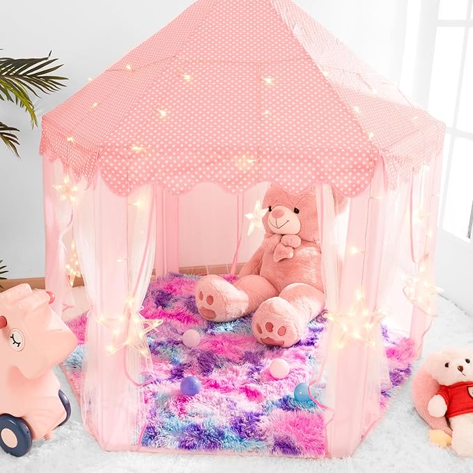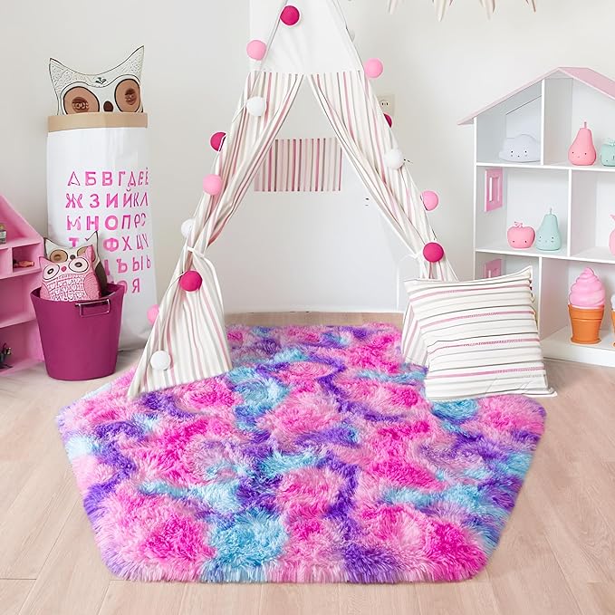 junovo Ultra Soft Hexagon Rug Fluffy Rainbow Nursery Rug for Princess Tent Kids Play Castle, Furry Hexagonal Carpet for Kids Girls Room Playhouse Classroom Dorm Home Decor, 4.6ft Tie-Dye Hot-Pink